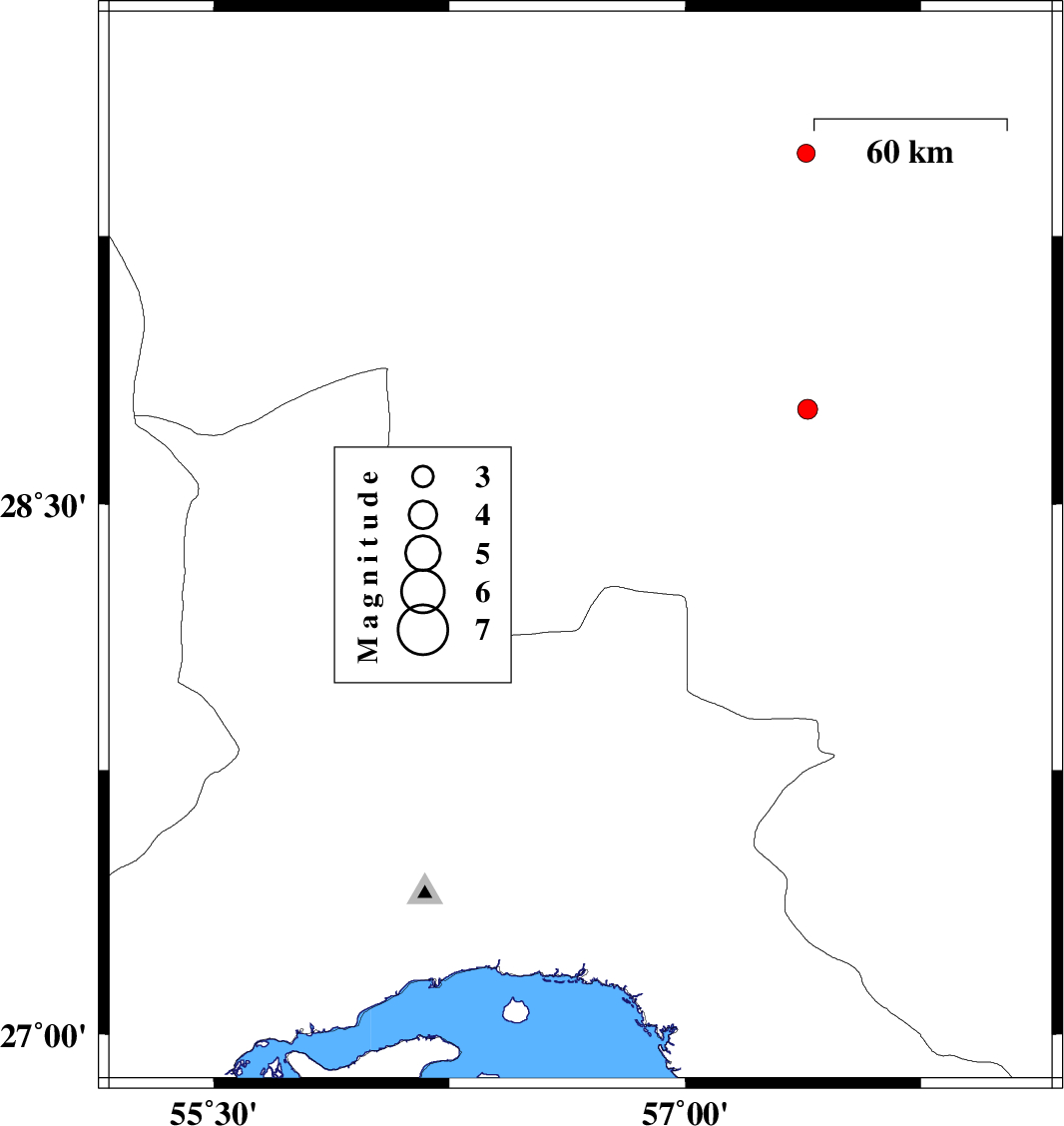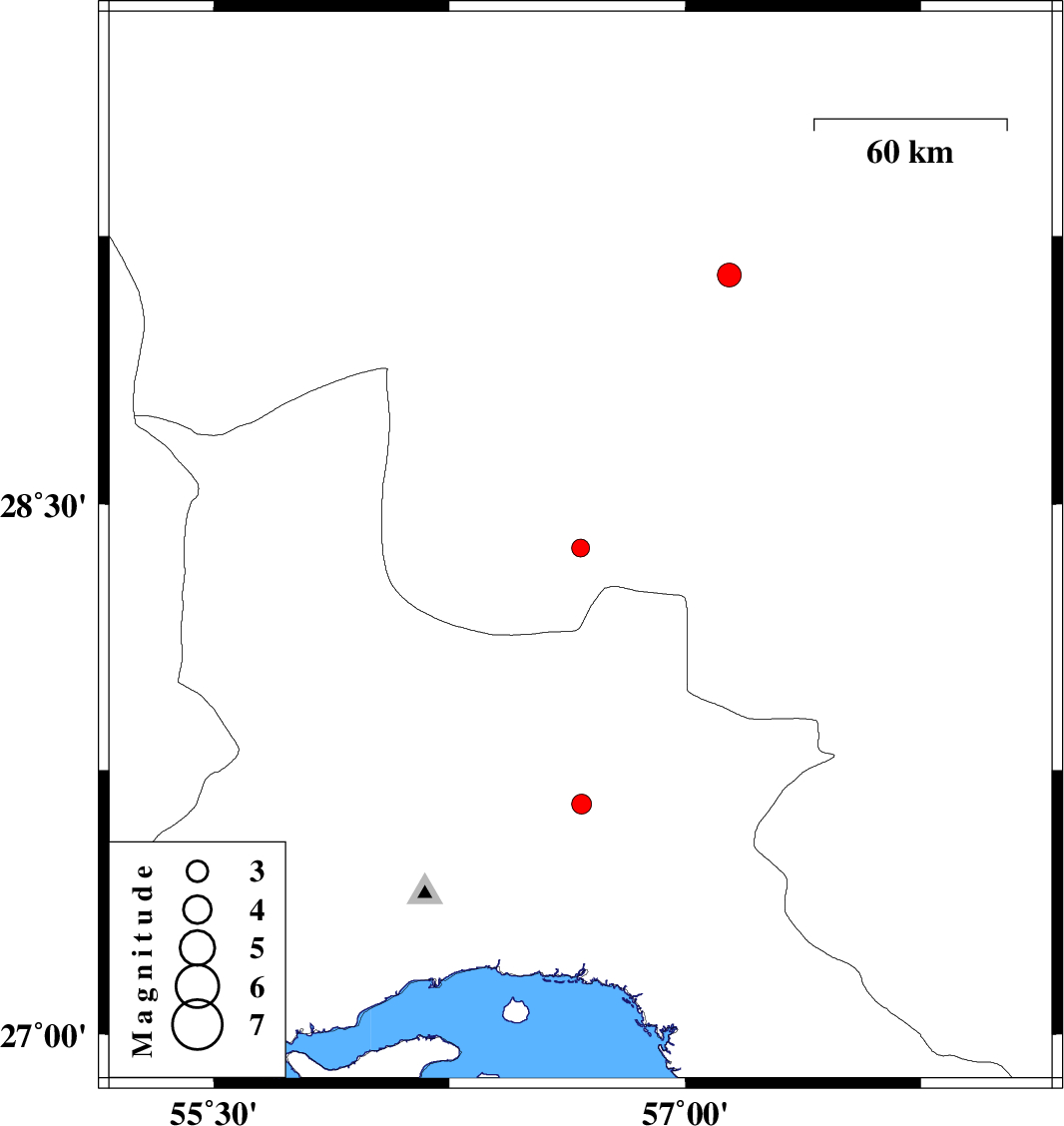 | 2018/03/30 | 11:58:12.0 | 16:28:12.0 | 27.653 | 56.671 | 17 | ML2.8 | Hormozgan Province, 61 km North-West of Dehbarez |