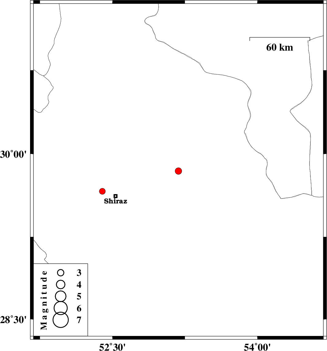 | 2018/06/02 | 23:54:56.6 | 04:24:56.6 | 29.662 | 52.396 | 6 | ML2.8 | Fars Province, 14 km -West of Shiraz |