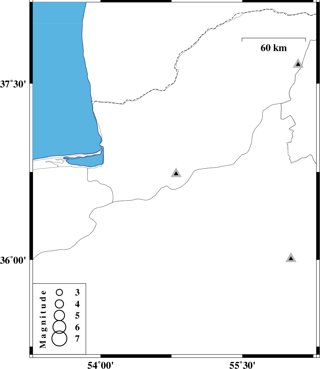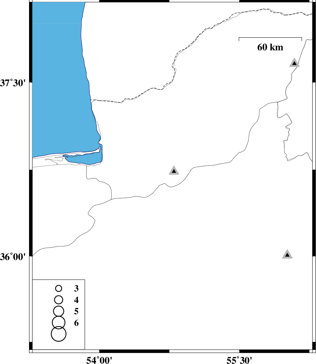 | 2018/06/06 | 08:41:33.7 | 13:11:33.7 | 36.682 | 54.783 | 14 | ML2.8 | Golestan Province, 26 km South of Ali Abad |