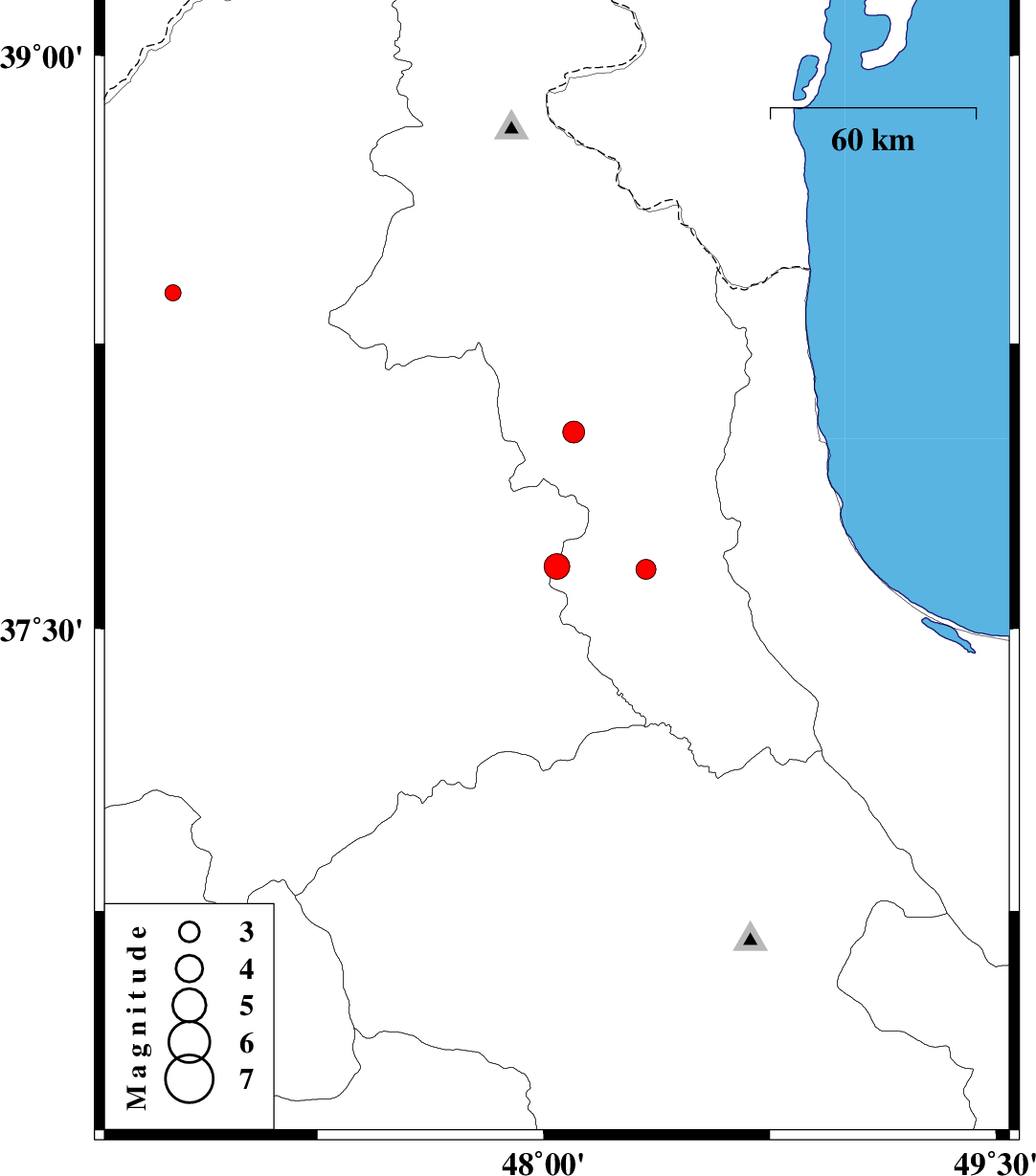 | 2018/05/31 | 23:52:30.8 | 04:22:30.8 | 38.018 | 48.099 | 15 | ML3.2 | Ardebil Province, 6 km of Nir |