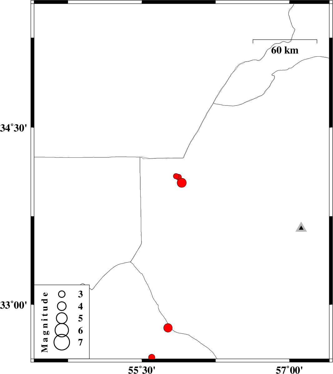 | 2018/06/21 | 07:19:01.8 | 11:49:01.8 | 34.034 | 55.905 | 15 | ML4.2 | Yazd Province, 106 km North-West of Tabas | ||