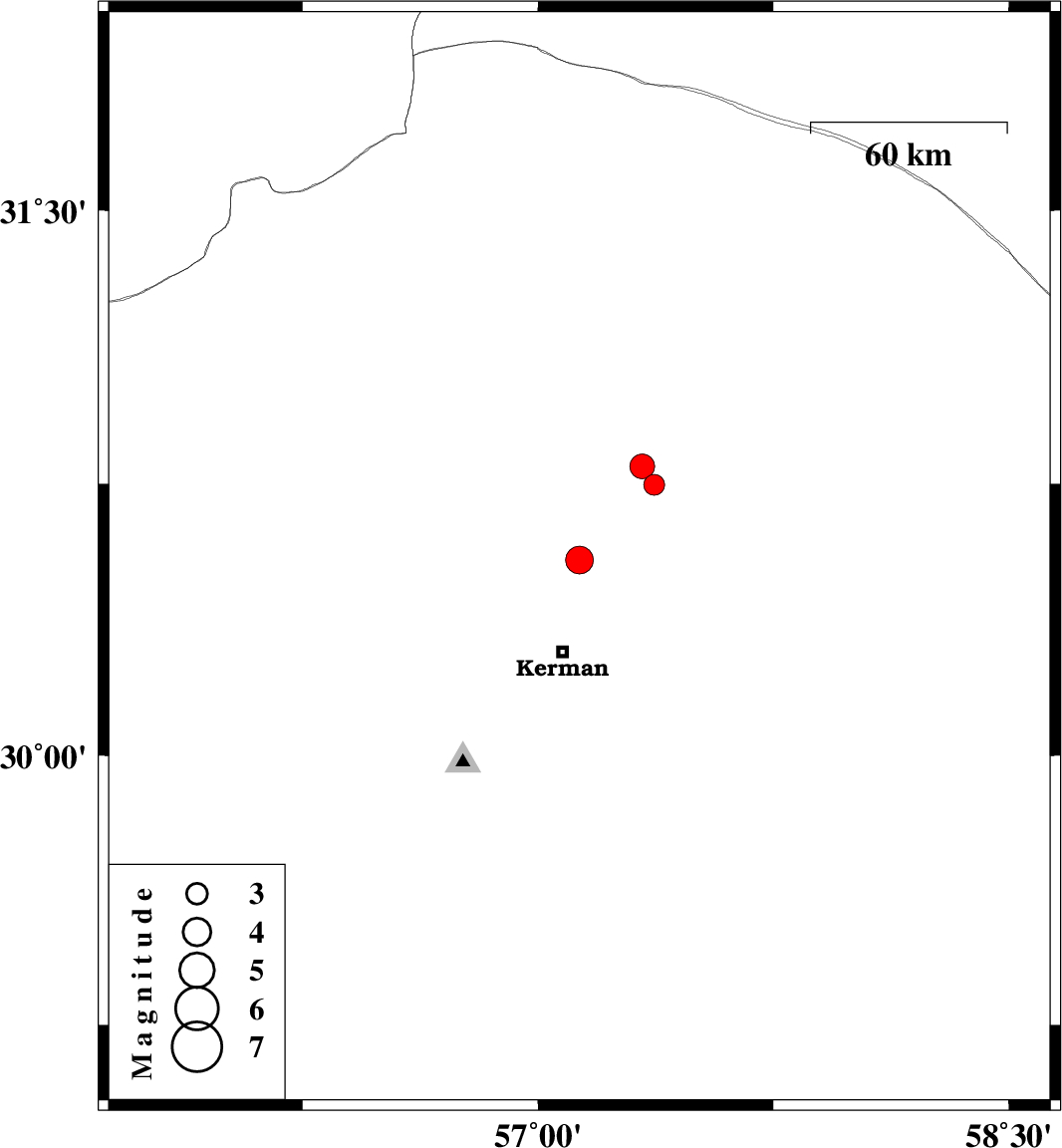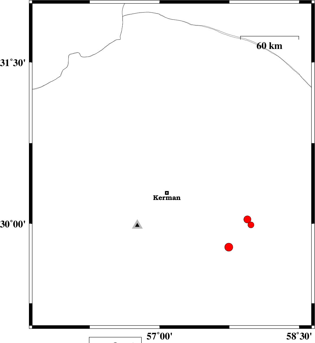 | 2018/06/21 | 19:42:49.7 | 00:12:49.7 | 30.799 | 57.332 | 14 | ML3.5 | Kerman Province, 62 km North-East of Kerman |