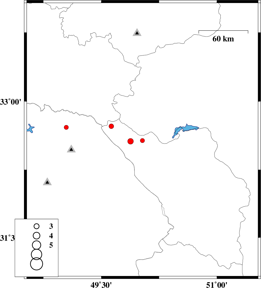 | 2018/06/27 | 19:38:44.3 | 00:08:44.3 | 32.736 | 49.785 | 15 | ML2.8 | Chaharmahal Bakhtiari Province, 38 km South-West of Fereydunshahr | ||