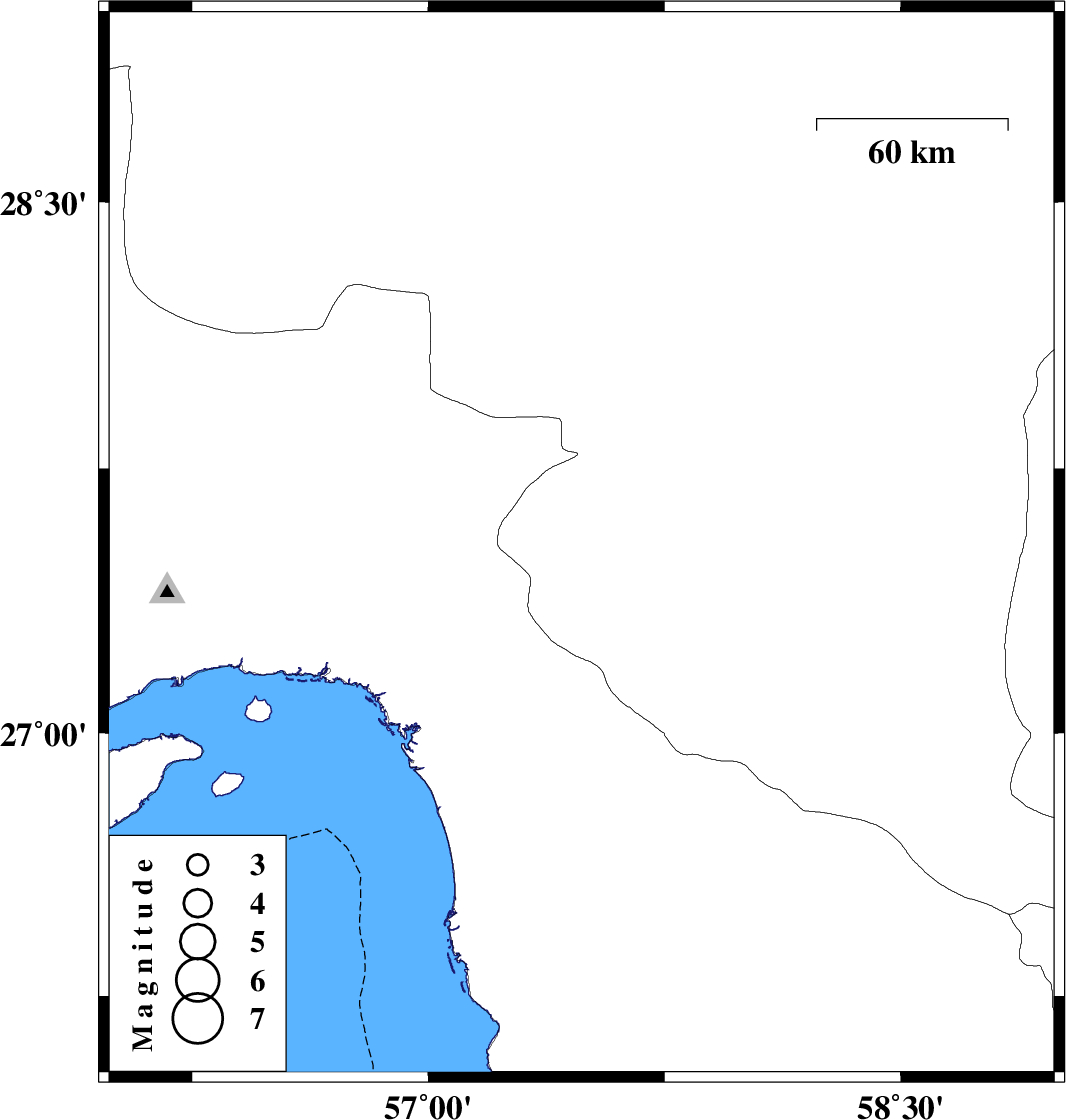 | 2018/06/27 | 23:46:33.9 | 04:16:33.9 | 27.533 | 57.487 | 15 | ML4 | Kerman Province, 14 km North of Manujan |