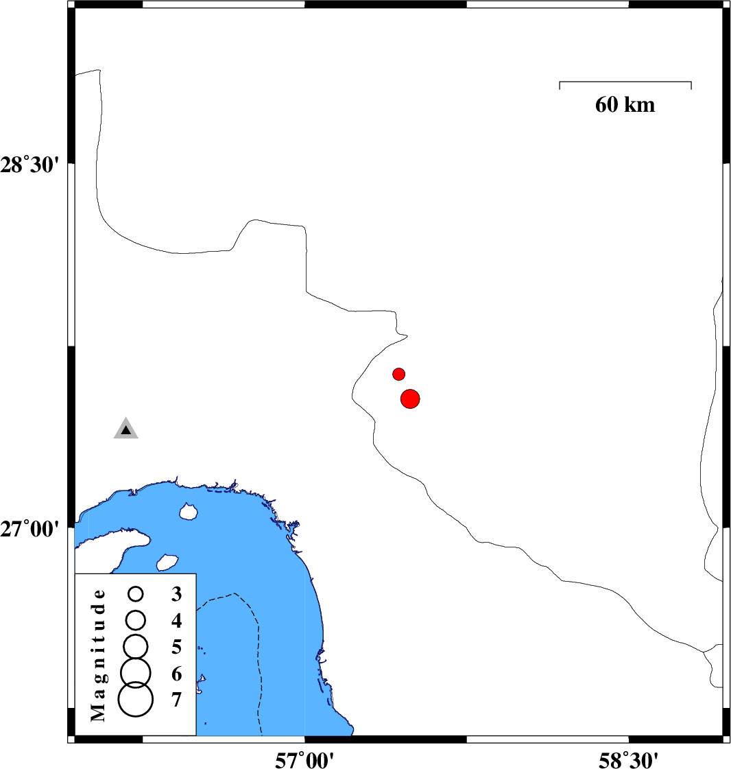 | 2018/06/27 | 23:46:33.9 | 04:16:33.9 | 27.533 | 57.487 | 15 | ML4 | Kerman Province, 14 km North of Manujan |