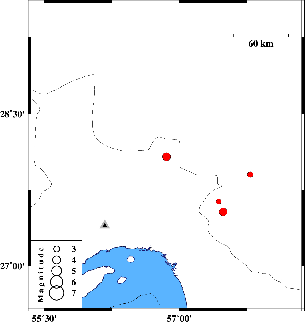 | 2018/06/27 | 23:46:33.9 | 04:16:33.9 | 27.533 | 57.487 | 15 | ML4 | Kerman Province, 14 km North of Manujan |