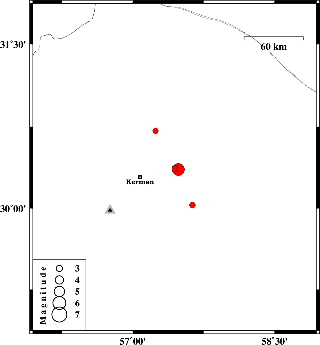 | 2018/07/22 | 20:39:15.6 | 01:09:15.6 | 30.358 | 57.483 | 14 | ML5.8 | Kerman Province, 40 km -East of Kerman |