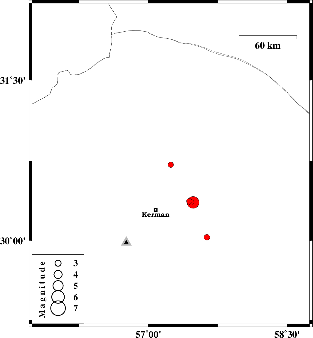 | 2018/07/22 | 20:39:15.6 | 01:09:15.6 | 30.358 | 57.483 | 14 | ML5.8 | Kerman Province, 40 km -East of Kerman |
