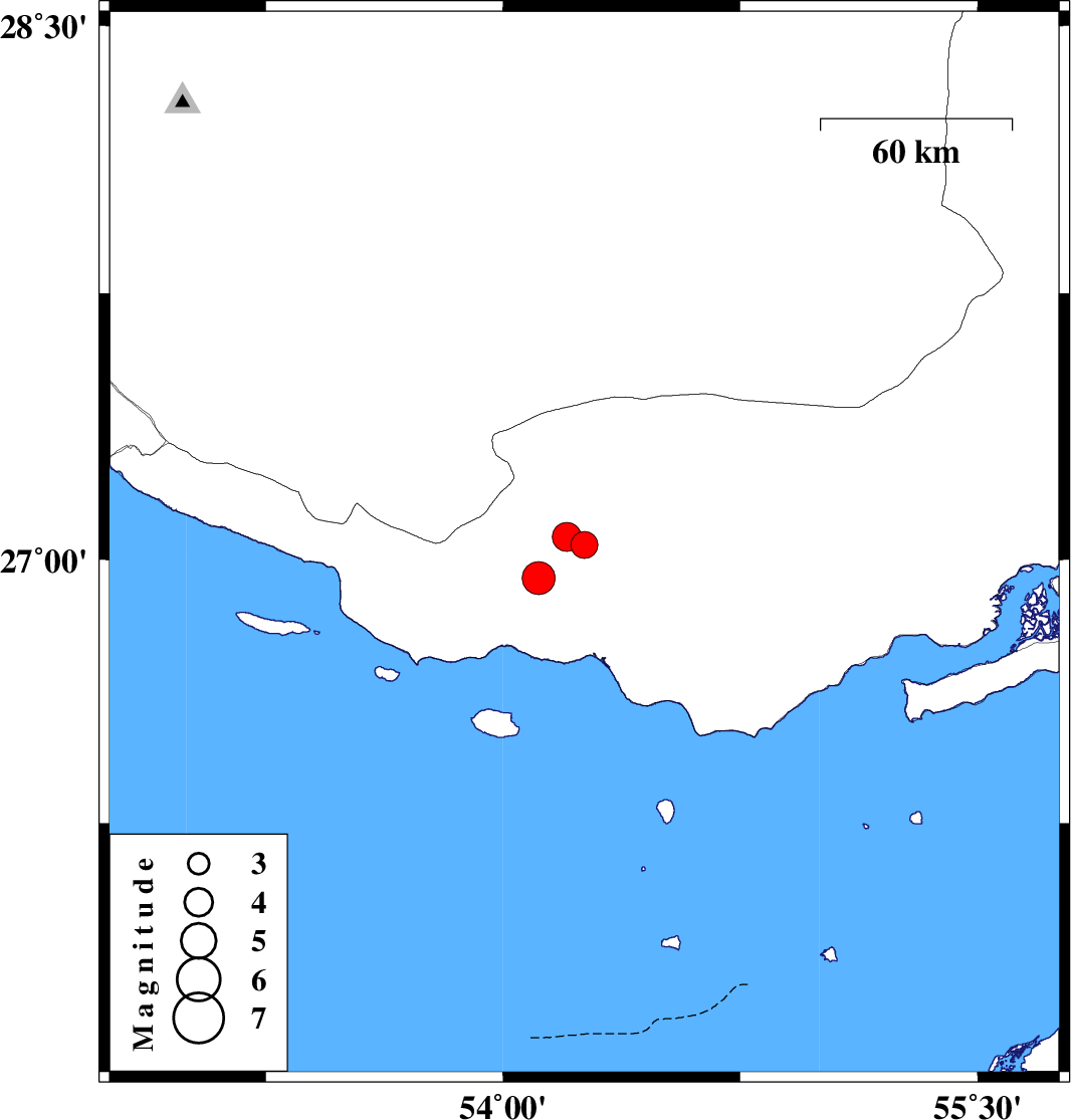 | 2018/08/24 | 18:18:42.8 | 22:48:42.8 | 27.041 | 54.257 | 15 | ML3.8 | Hormozgan Province, 20 km South-West of Bastak | ||