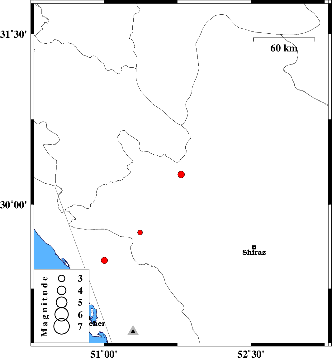 | 2018/07/31 | 01:21:20.0 | 05:51:20.0 | 29.75 | 51.369 | 14 | ML2.2 | Fars Province, 31 km North-West of Kazerun |
