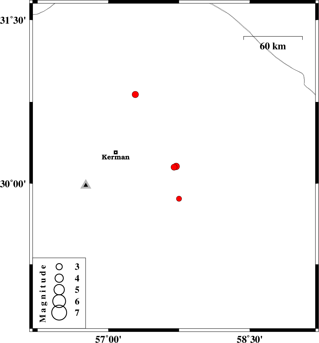 | 2018/09/01 | 00:27:01.1 | 04:57:01.1 | 29.86 | 57.75 | 14 | ML2.5 | Kerman Province, 80 km South-East of Kerman | ||
