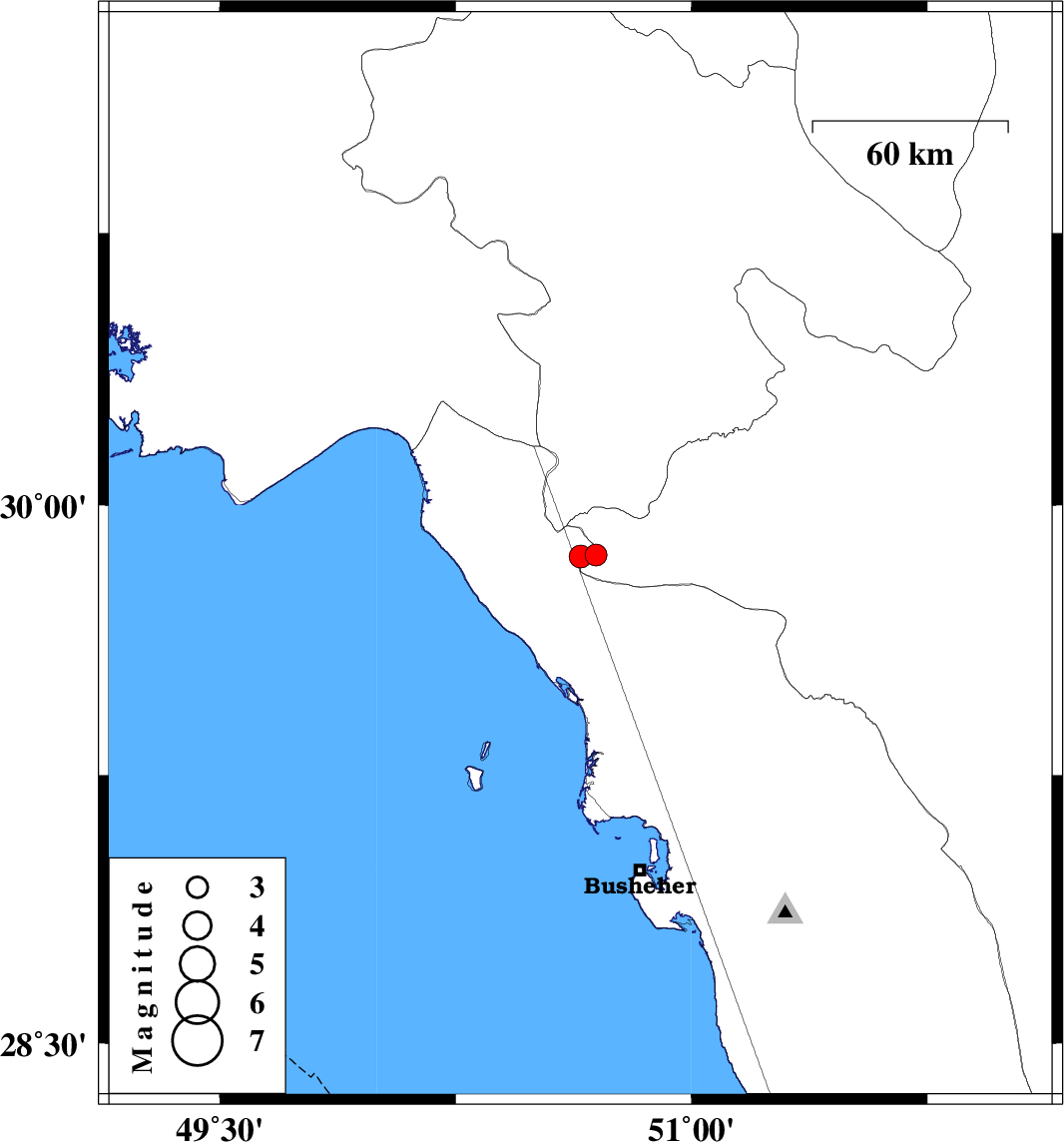 | 2018/09/10 | 12:35:26.3 | 17:05:26.3 | 29.858 | 50.647 | 6 | ML3.2 | Bushehr Province, 34 km North-East of Bandar-e genaveh |