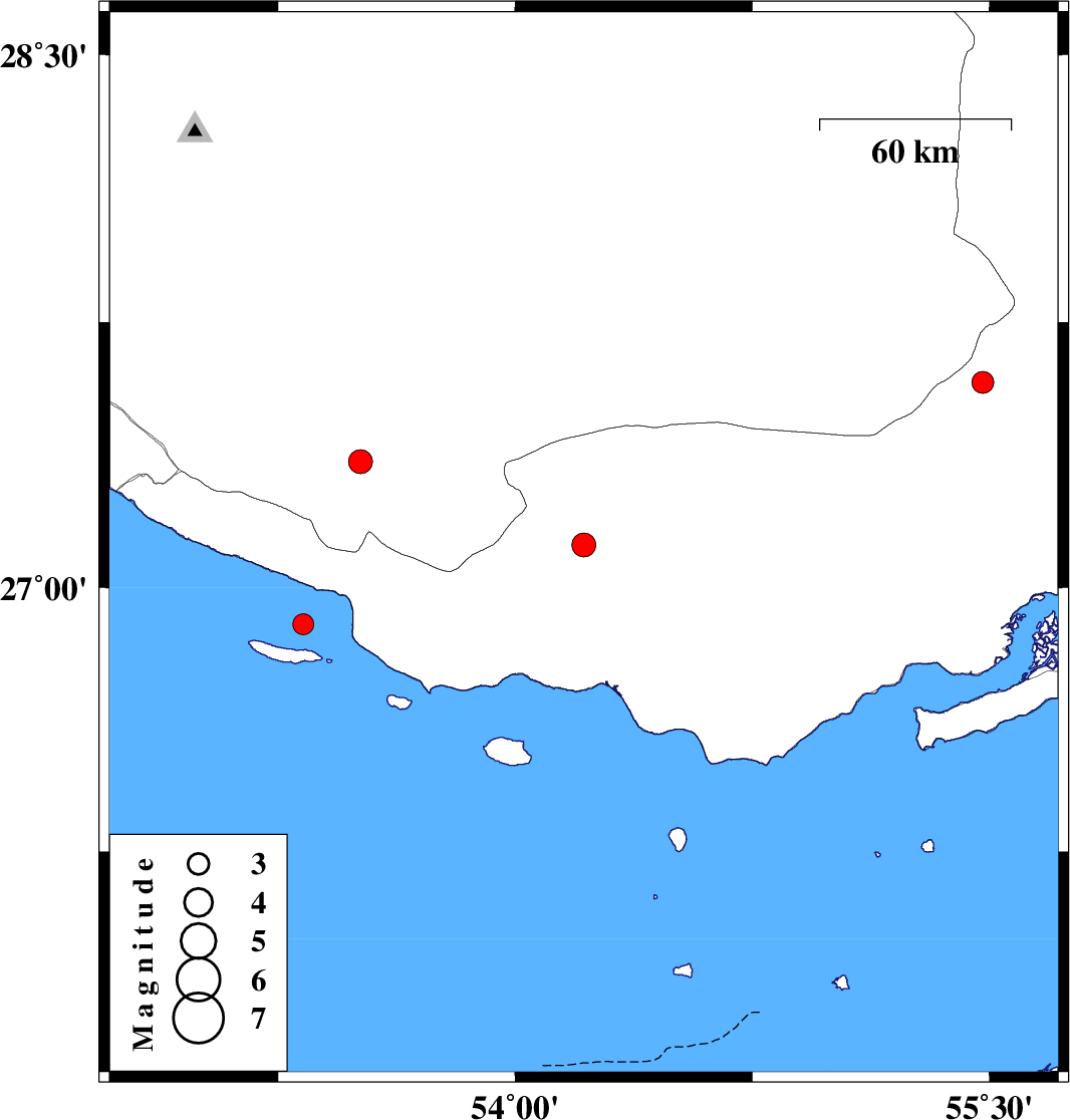 | 2018/09/16 | 02:03:09.1 | 06:33:09.1 | 26.896 | 53.33 | 16 | ML3 | Persian Gulf, 51 km South-East of Lamerd | ||