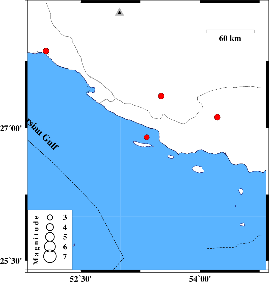 | 2018/09/16 | 01:07:28.0 | 05:37:28.0 | 27.861 | 52.062 | 14 | ML3.4 | Bushehr Province, 4 km of Bandar-e kangan |