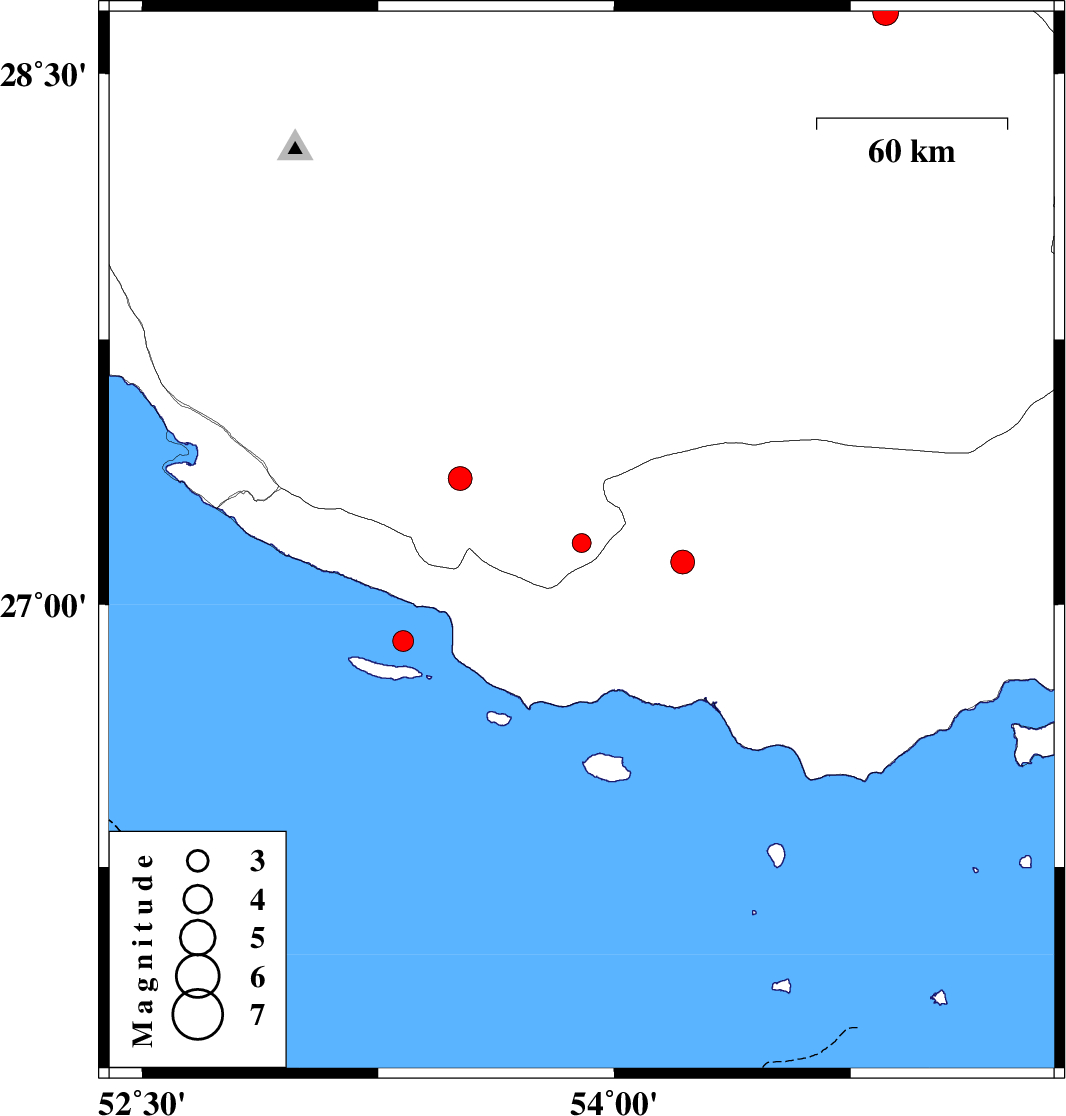 | 2018/09/16 | 02:03:09.1 | 06:33:09.1 | 26.896 | 53.33 | 16 | ML3 | Persian Gulf, 51 km South-East of Lamerd | ||