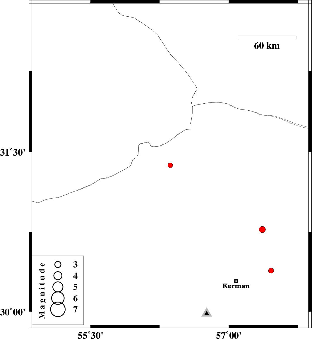 | 2018/09/21 | 00:33:47.3 | 05:03:47.3 | 30.773 | 57.363 | 14 | ML3.1 | Kerman Province, 60 km North-East of Kerman |