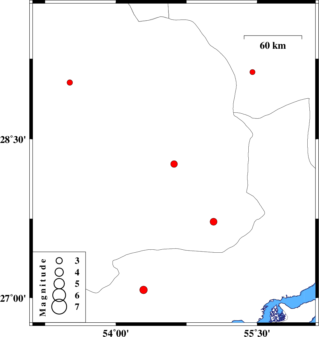 | 2018/09/29 | 09:08:17.2 | 12:38:17.2 | 27.075 | 54.295 | 15 | ML3.6 | Hormozgan Province, 15 km South of Bastak | ||