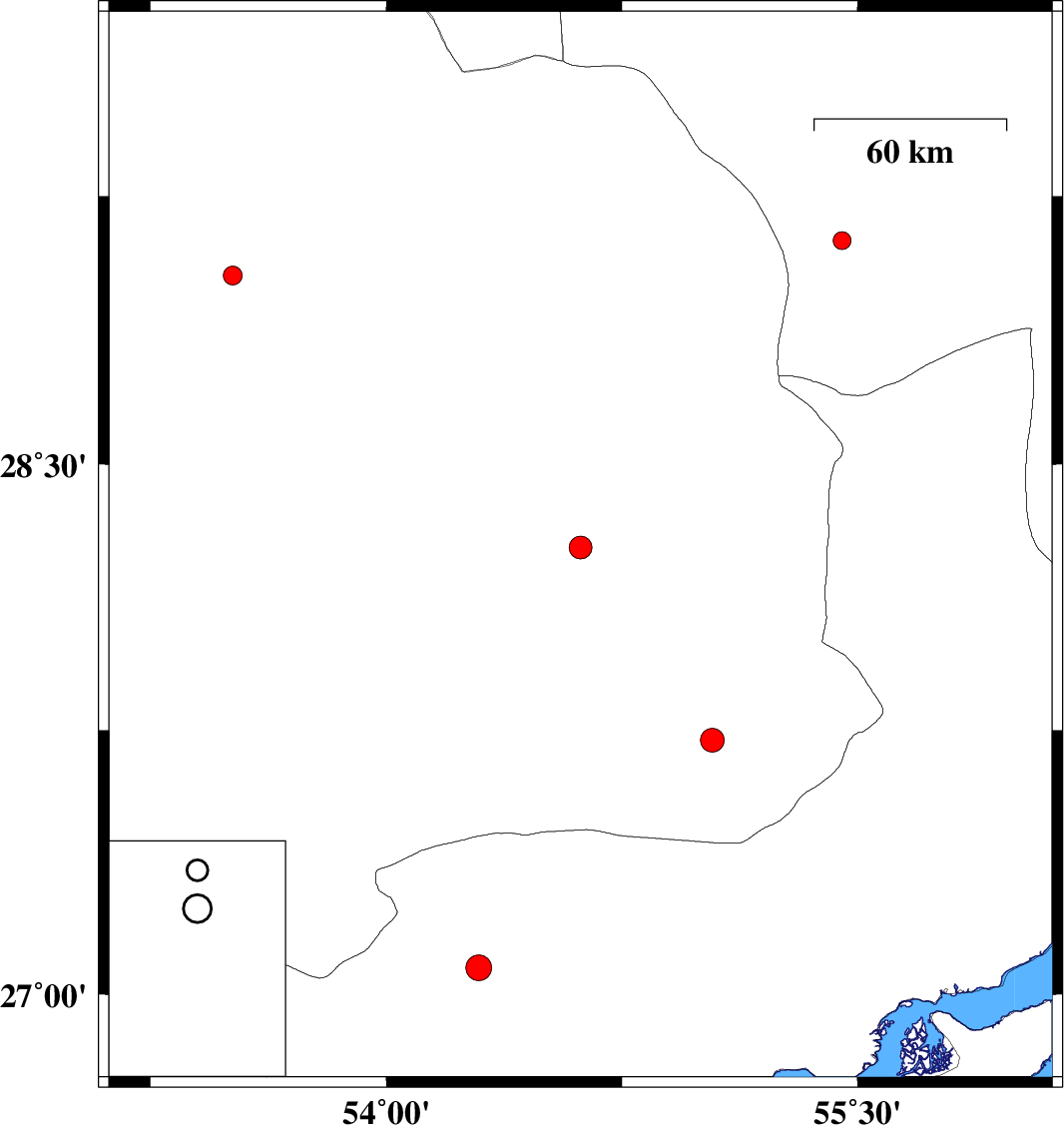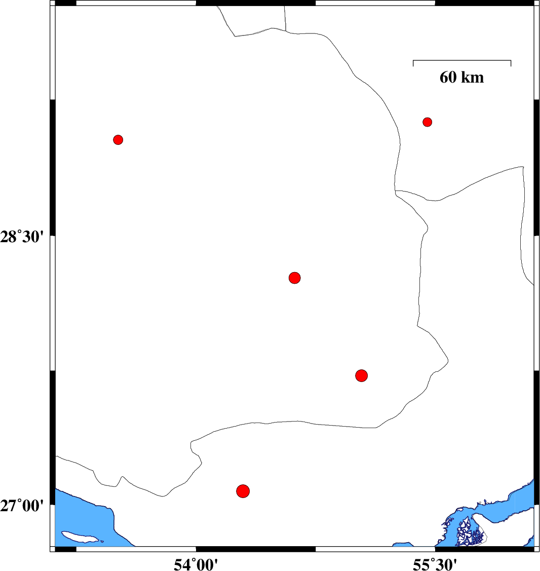 | 2018/09/29 | 15:27:32.5 | 18:57:32.5 | 28.265 | 54.618 | 18 | ML3.3 | Fars Province, 55 km South of Darab | ||