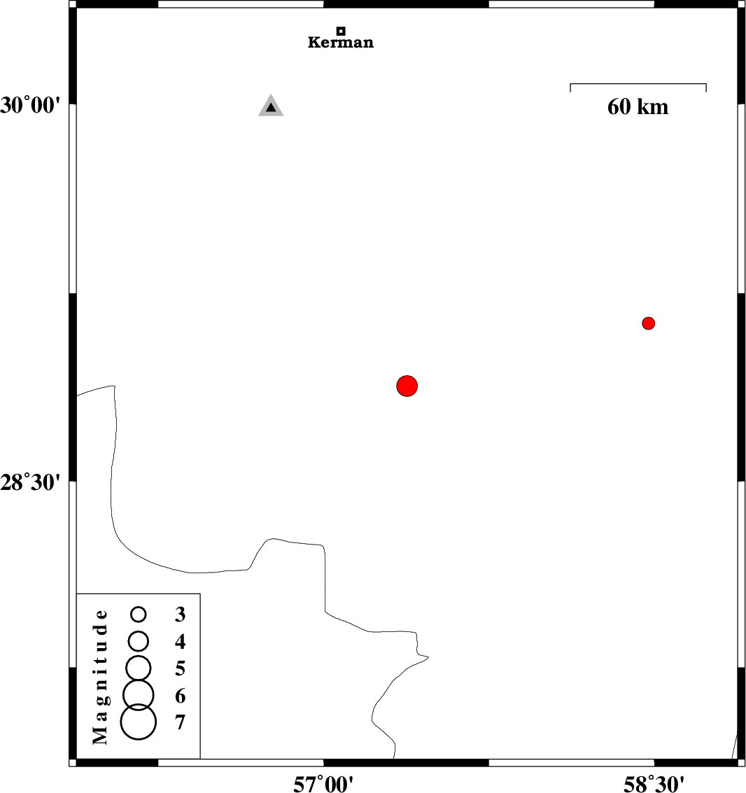 | 2018/09/26 | 01:39:50.2 | 05:09:50.2 | 29.13 | 58.474 | 14 | ML2.5 | Kerman Province, 12 km -East of Bam |