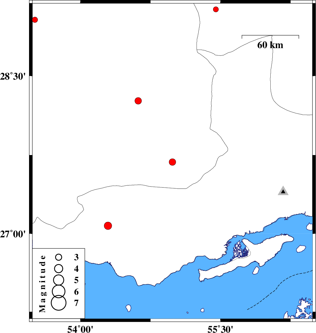 | 2018/09/29 | 09:08:17.2 | 12:38:17.2 | 27.075 | 54.295 | 15 | ML3.6 | Hormozgan Province, 15 km South of Bastak | ||