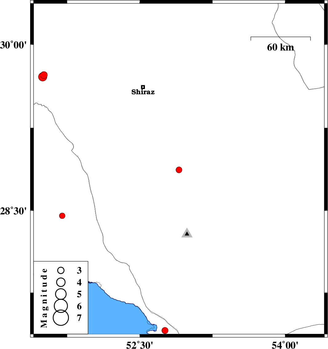 | 2018/10/01 | 08:40:53.9 | 12:10:53.9 | 27.402 | 52.76 | 14 | ML2.9 | Bushehr Province, 20 km South-West of Mehr | ||