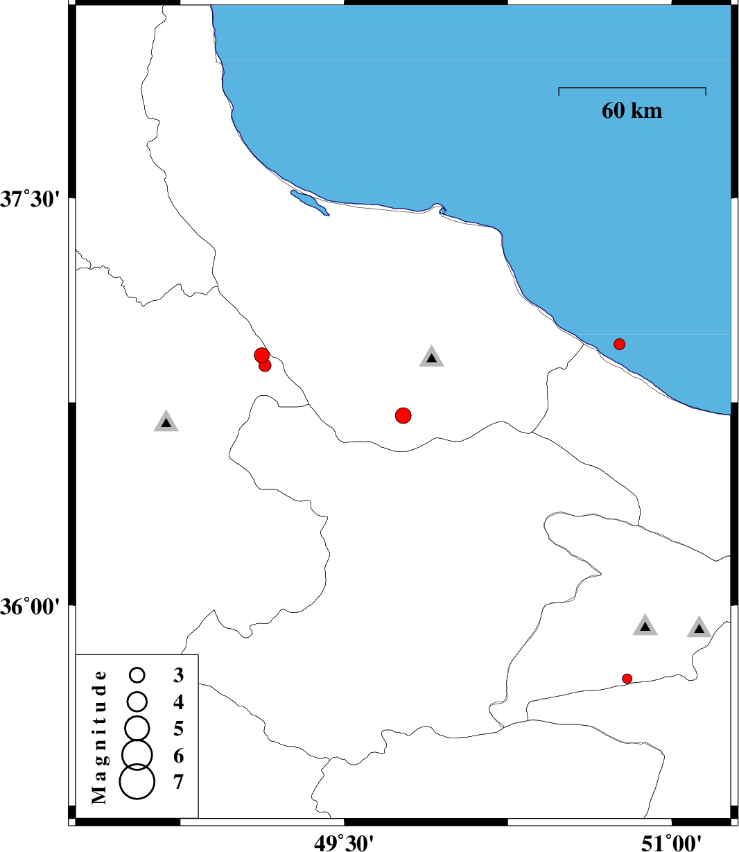 | 2018/10/01 | 03:16:03.2 | 06:46:03.2 | 36.965 | 50.761 | 14 | ML2.2 | Caspian Sea, 12 km -East of Ramsar |