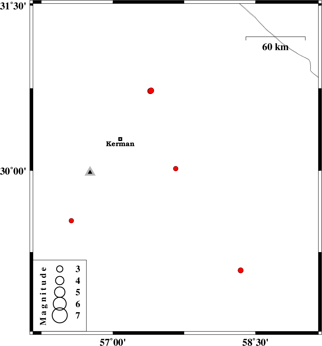 | 2018/10/08 | 00:34:51.2 | 04:04:51.2 | 30.725 | 57.395 | 14 | ML2.7 | Kerman Province, 57 km North-East of Kerman |