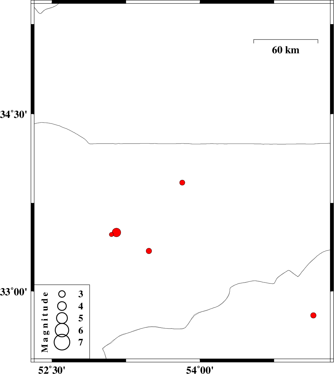| 2018/10/16 | 00:28:55.2 | 03:58:55.2 | 33.922 | 53.82 | 14 | ML2.4 | Esfahan Province, 135 km North-East of Nain | ||
