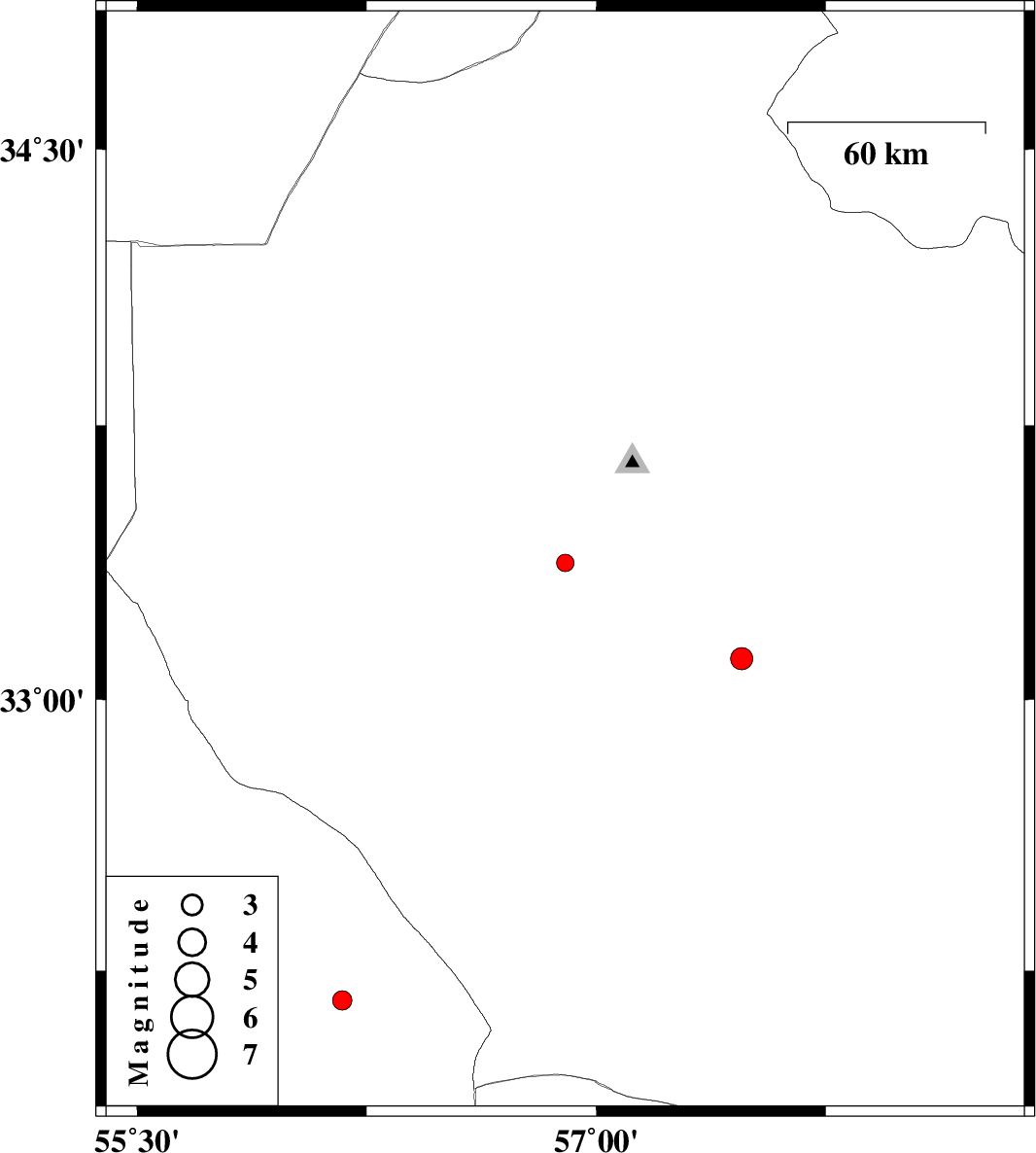 | 2018/10/14 | 21:55:22.7 | 01:25:22.7 | 33.112 | 57.476 | 14 | ML3.2 | Yazd Province, 74 km South-East of Tabas | ||