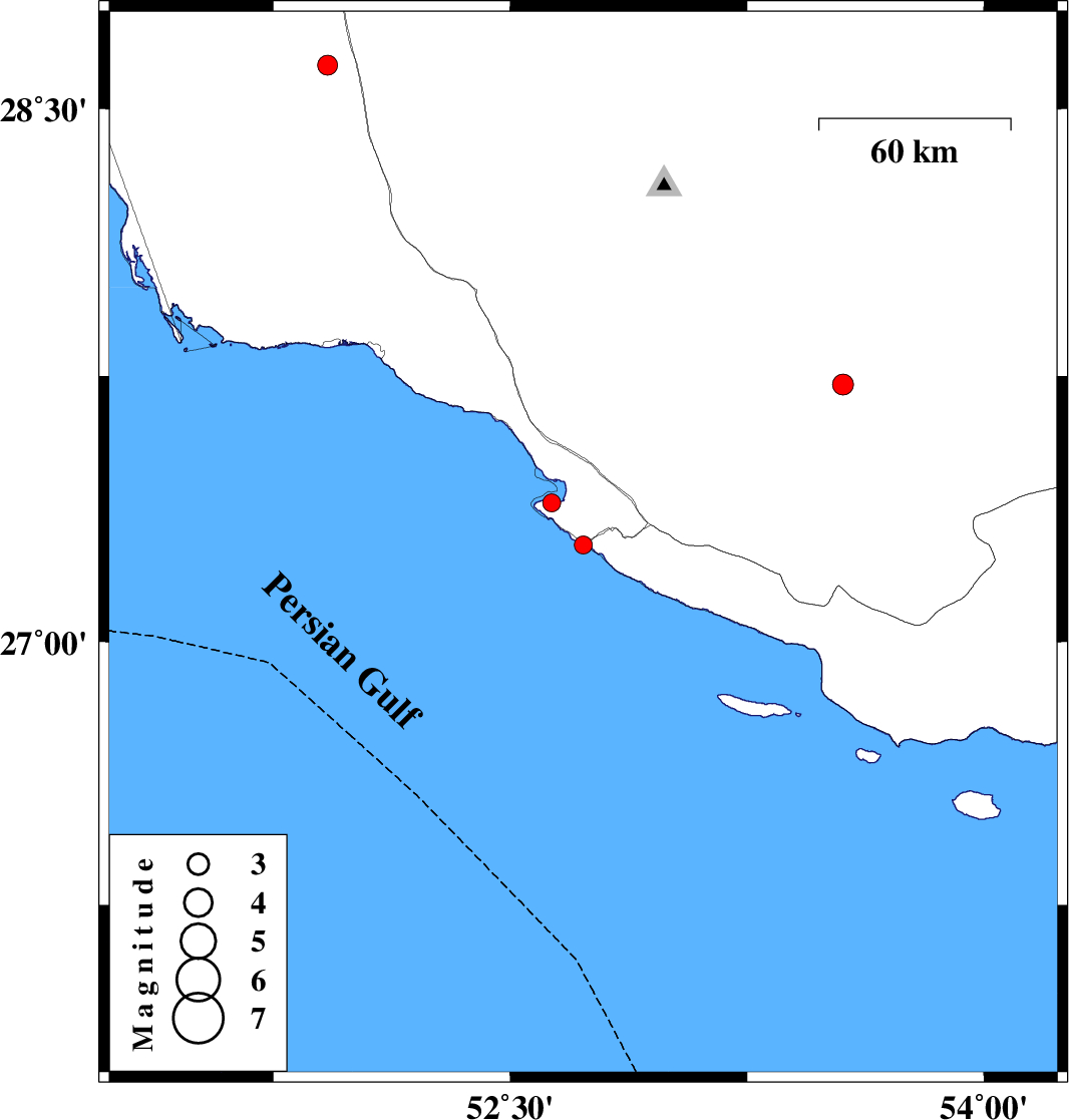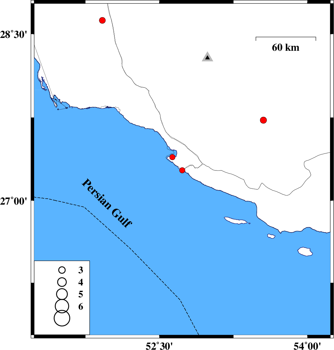 | 2018/10/15 | 20:37:44.4 | 00:07:44.4 | 27.393 | 52.631 | 14 | ML2.6 | Bushehr Province, 31 km South-West of Mehr |