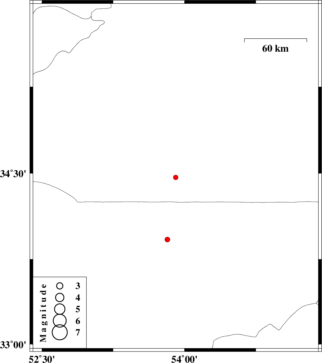| 2018/10/16 | 00:28:55.2 | 03:58:55.2 | 33.922 | 53.82 | 14 | ML2.4 | Esfahan Province, 135 km North-East of Nain |
