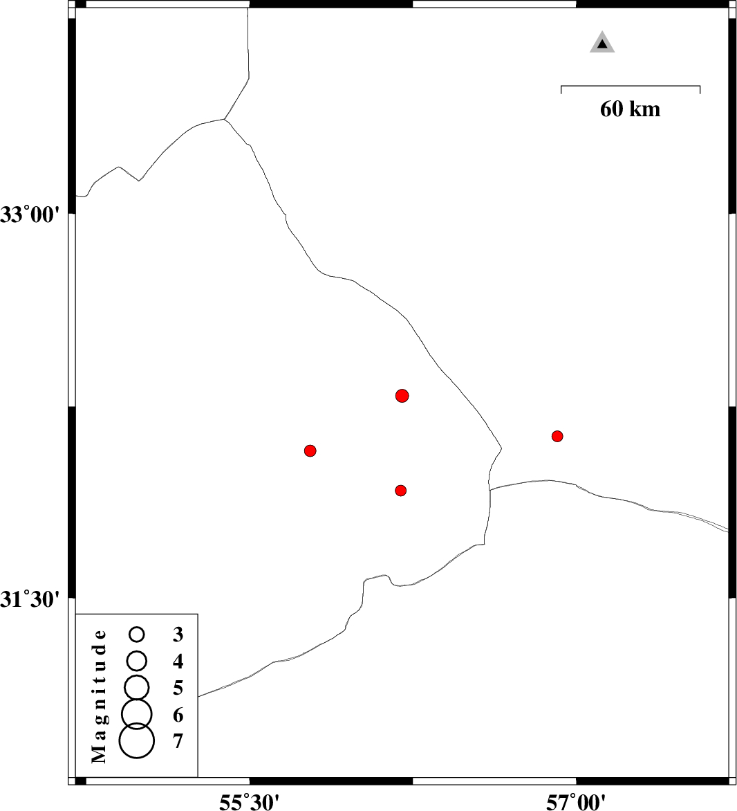 | 2018/10/27 | 00:40:30.1 | 04:10:30.1 | 32.292 | 56.2 | 14 | ML2.7 | Yazd Province, 108 km North-East of Bafq | ||
