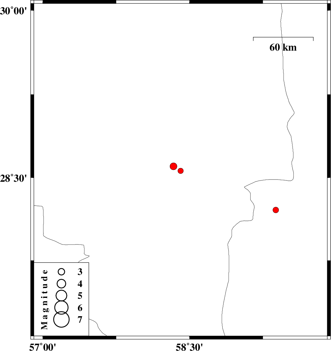 | 2018/11/04 | 02:13:08.1 | 05:43:08.1 | 28.603 | 58.336 | 14 | ML3.3 | Kerman Province, 56 km South of Bam | ||