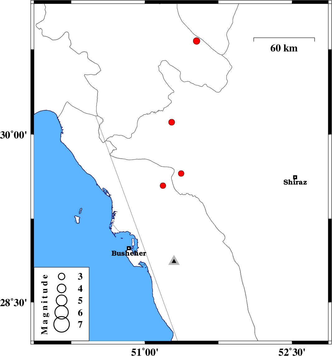 | 2018/11/12 | 05:15:42.2 | 08:45:42.2 | 29.544 | 51.184 | 14 | ML2.7 | Bushehr Province, 31 km North of Borazjan |