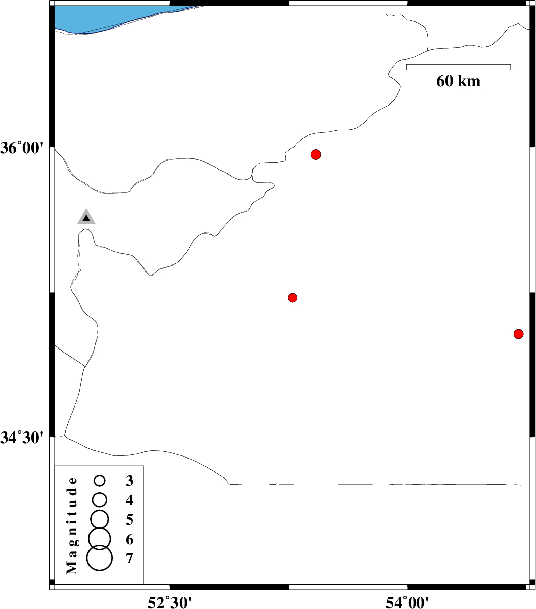 | 2018/11/14 | 02:13:28.9 | 05:43:28.9 | 35.961 | 53.421 | 15 | ML2.8 | Semnan Province, 44 km North of Semnan |