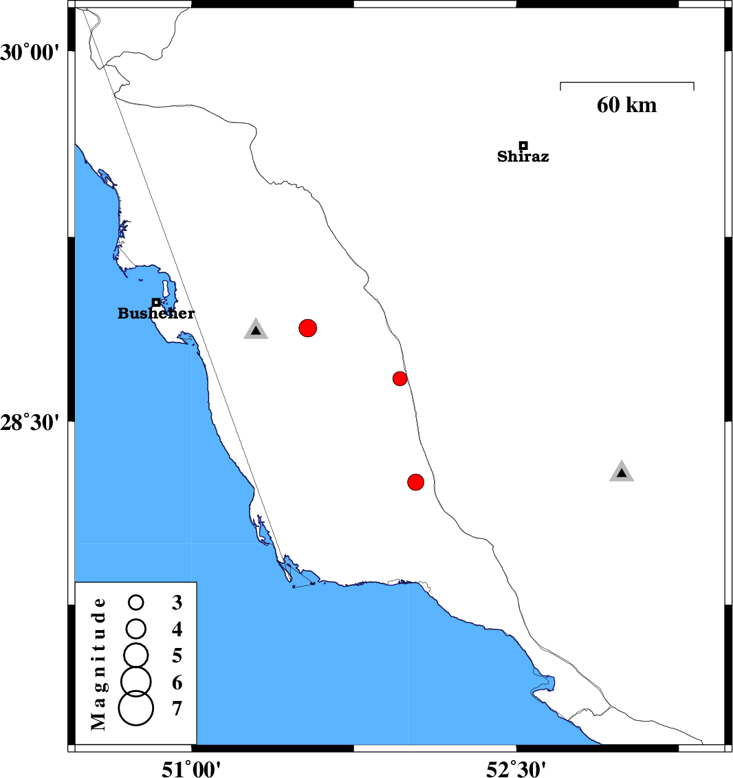 | 2018/11/26 | 00:49:47.5 | 04:19:47.5 | 28.88 | 51.536 | 10 | ML3.7 | Bushehr Province, 27 km -East of Ahram |