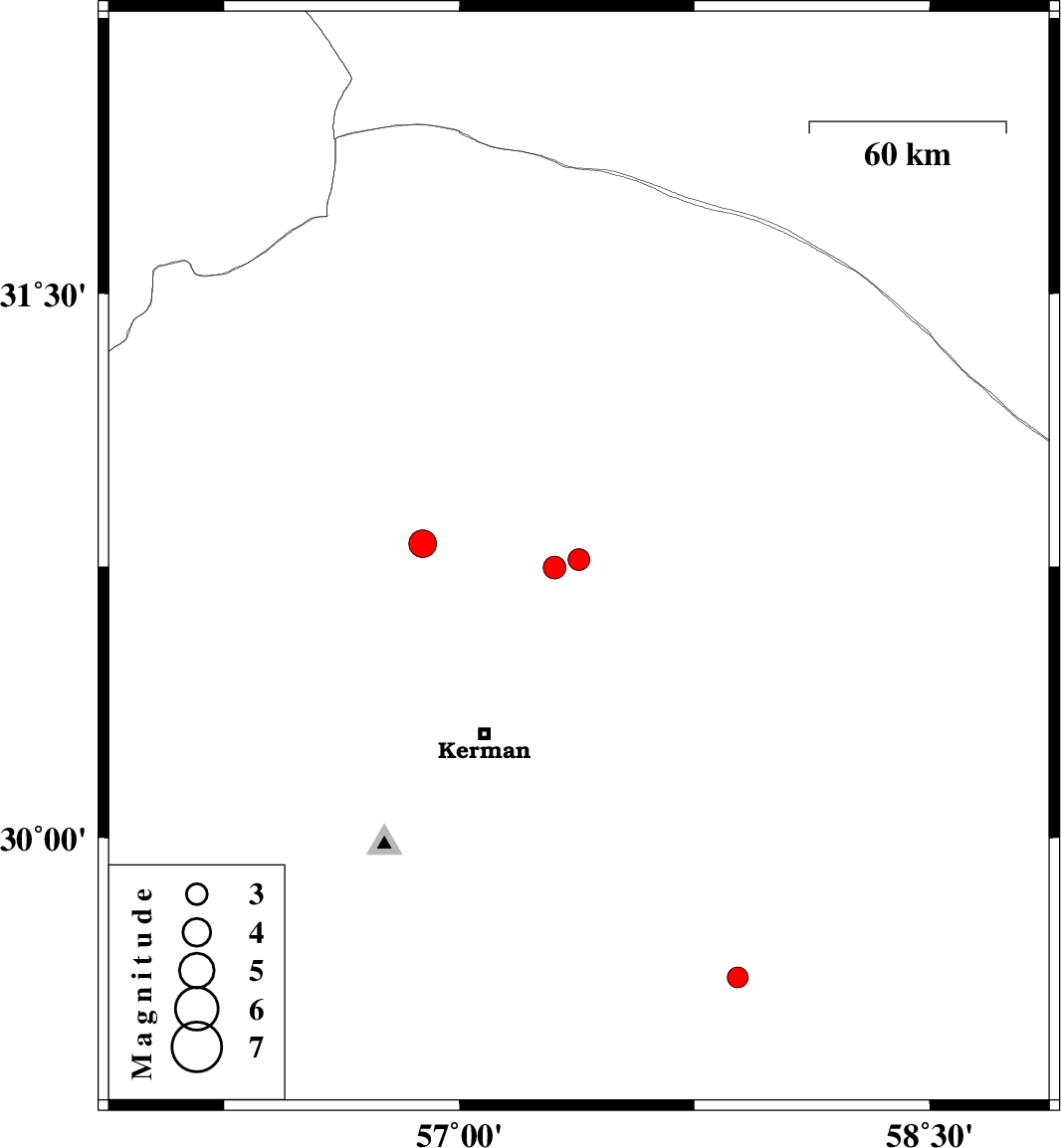 | 2018/11/25 | 04:44:26.1 | 08:14:26.1 | 30.813 | 56.882 | 14 | ML3.9 | Kerman Province, 30 km -East of Zarand |