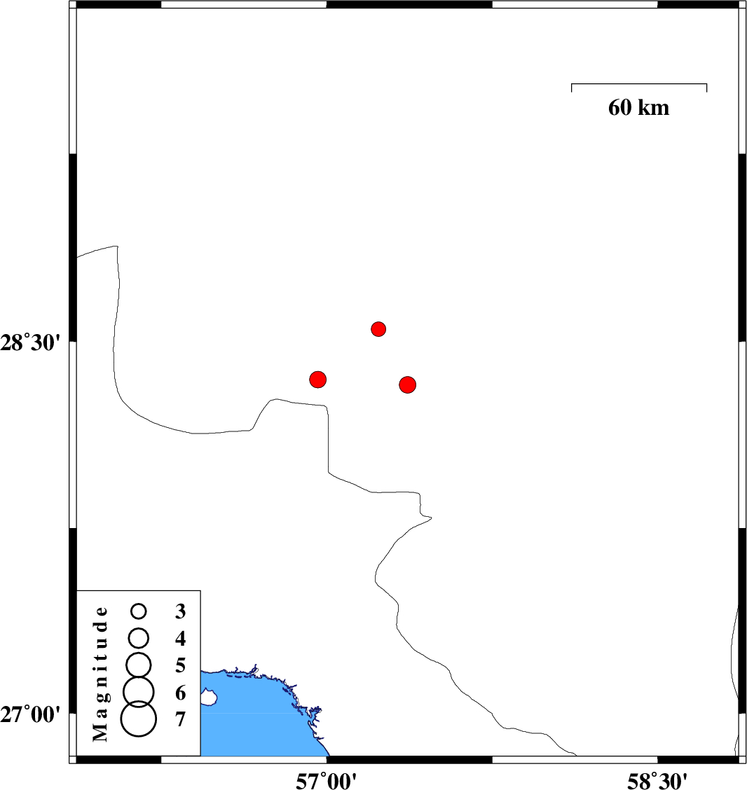 | 2018/12/08 | 12:22:25.4 | 15:52:25.4 | 28.347 | 56.959 | 15 | ML3.4 | Kerman Province, 104 km -East of Hajiabad |