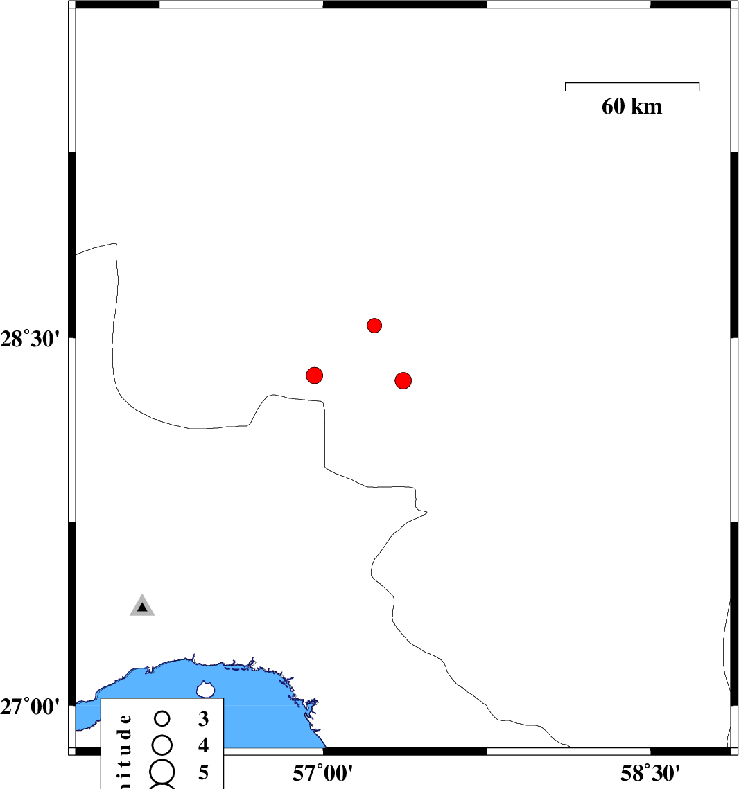| 2018/12/13 | 17:30:03.6 | 21:00:03.6 | 28.327 | 57.366 | 14 | ML3.4 | Kerman Province, 53 km North-West of Kahnuj | ||