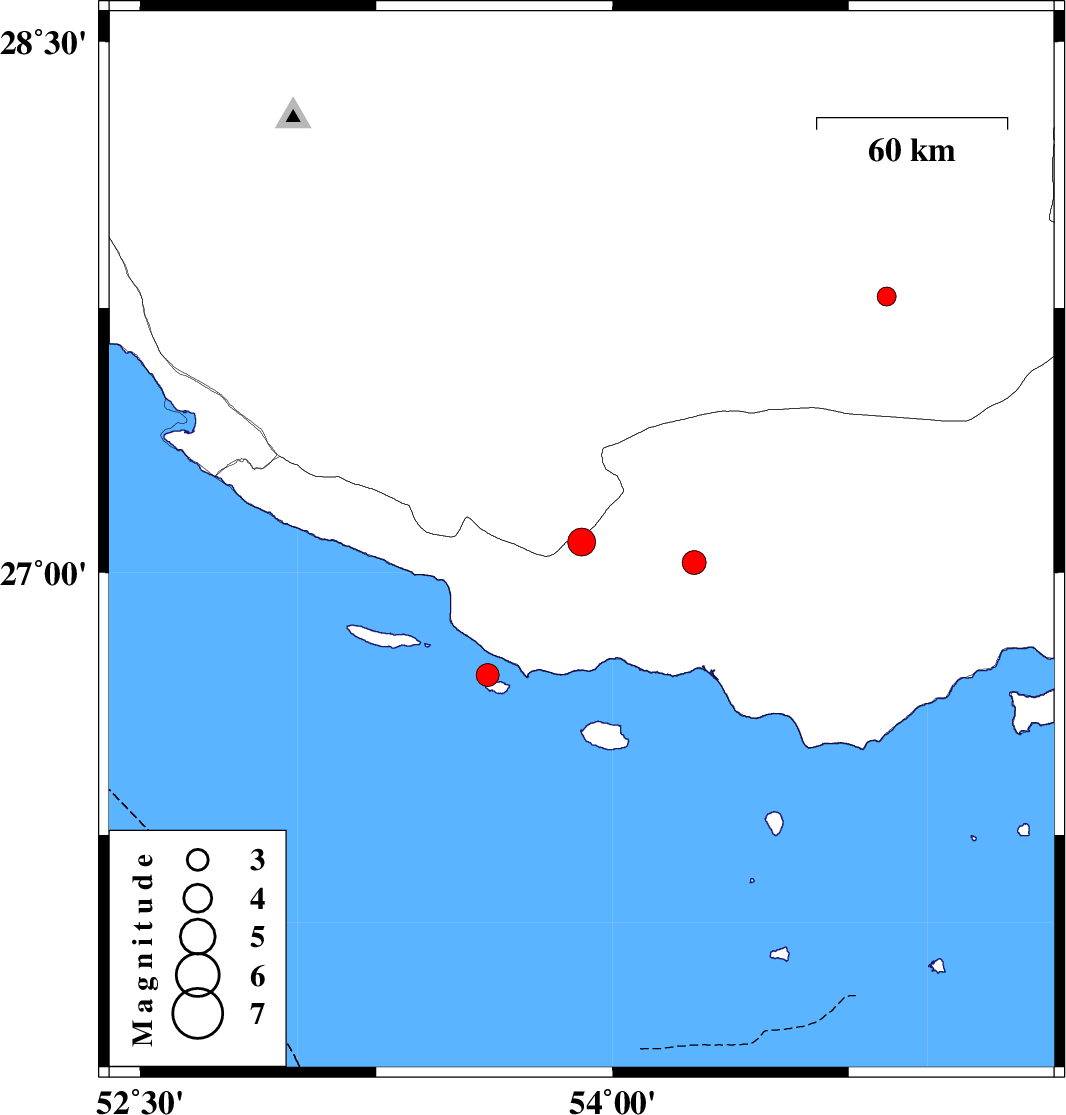 | 2018/11/27 | 22:56:43.6 | 02:26:43.6 | 27.782 | 54.87 | 15 | ML2.7 | Fars Province, 54 km North-East of Lar |