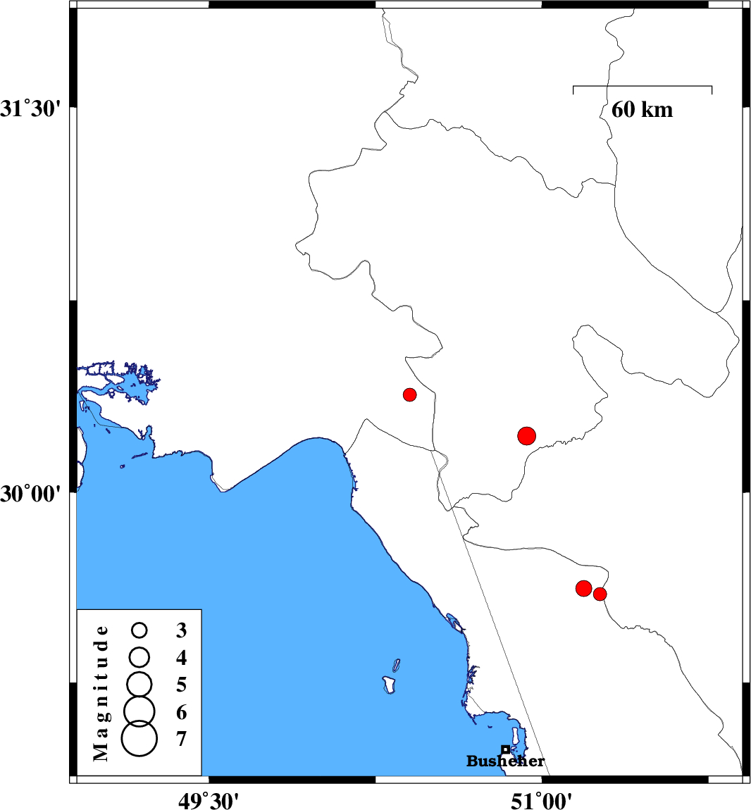 | 2018/12/13 | 12:29:09.7 | 15:59:09.7 | 29.599 | 51.261 | 17 | ML2.7 | Bushehr Province, 38 km North of Borazjan | ||