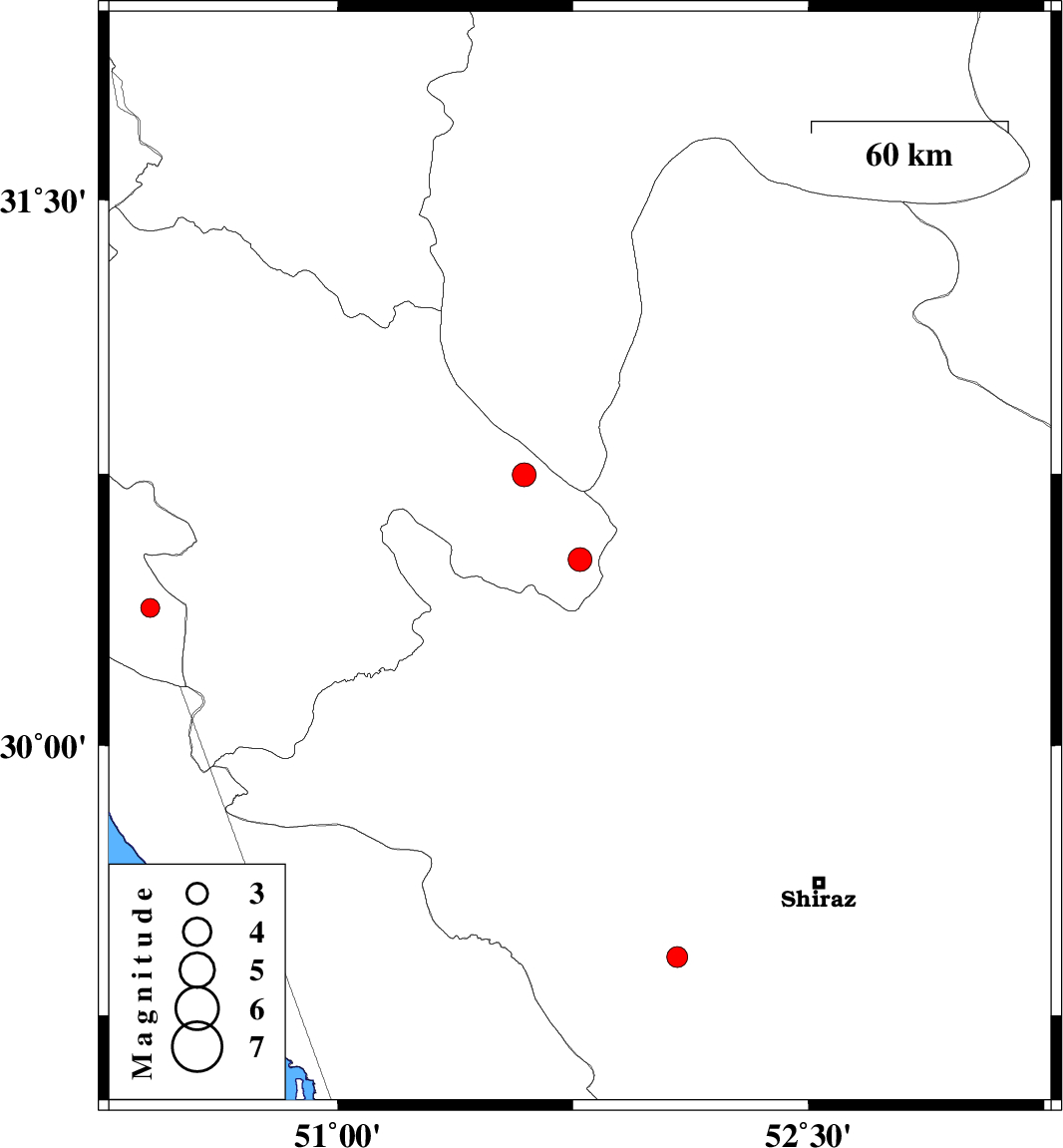 | 2018/12/16 | 04:05:58.0 | 07:35:58.0 | 29.413 | 52.081 | 15 | ML2.9 | Fars Province, 60 km North of Farashband |