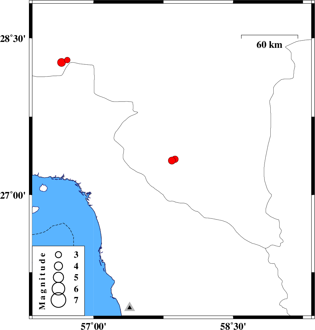 | 2019/01/01 | 01:20:45.5 | 04:50:45.5 | 27.342 | 57.875 | 14 | ML3.2 | Kerman Province, 38 km -East of Manujan | ||
