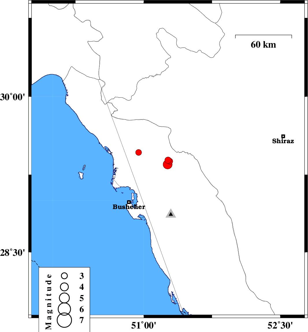 | 2019/01/02 | 07:57:28.7 | 11:27:28.7 | 29.349 | 51.262 | 16 | ML4.5 | Bushehr Province, 11 km of Borazjan | ||