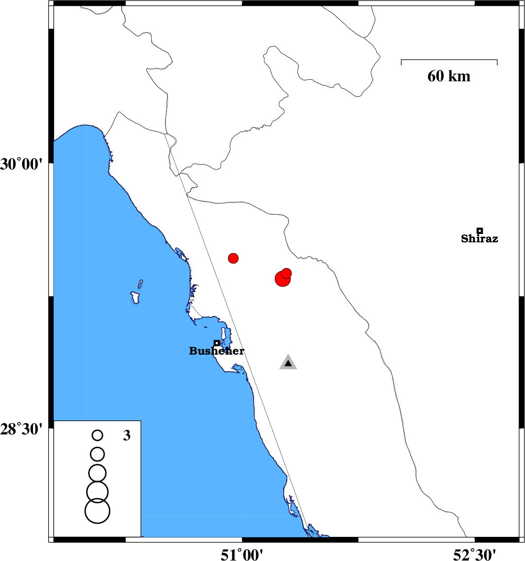| 2018/12/29 | 15:20:58.0 | 18:50:58.0 | 29.464 | 50.944 | 14 | ML3 | Bushehr Province, 34 km North-West of Borazjan |