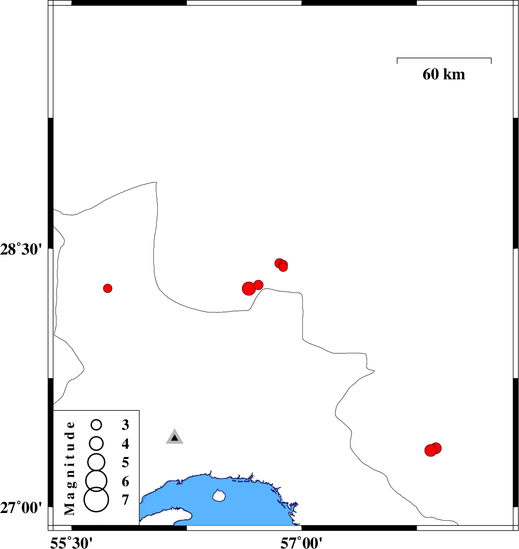 2019/01/01 01:20:45.5 04:50:45.5 27.34257.87514 ML3.2 Kerman Province, 38 km -East of Manujan
