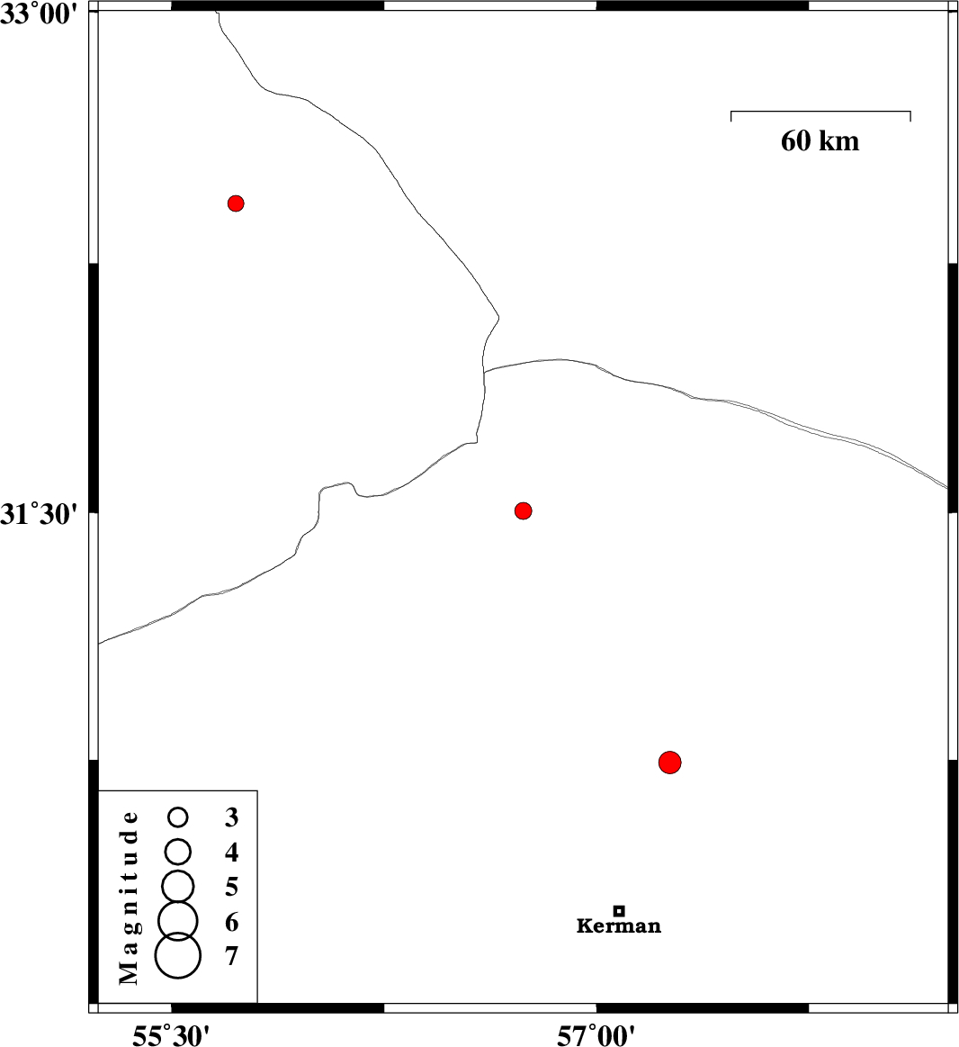 | 2019/01/15 | 23:52:30.7 | 03:22:30.7 | 30.741 | 57.259 | 14 | ML3.5 | Kerman Province, 53 km North-East of Kerman | ||