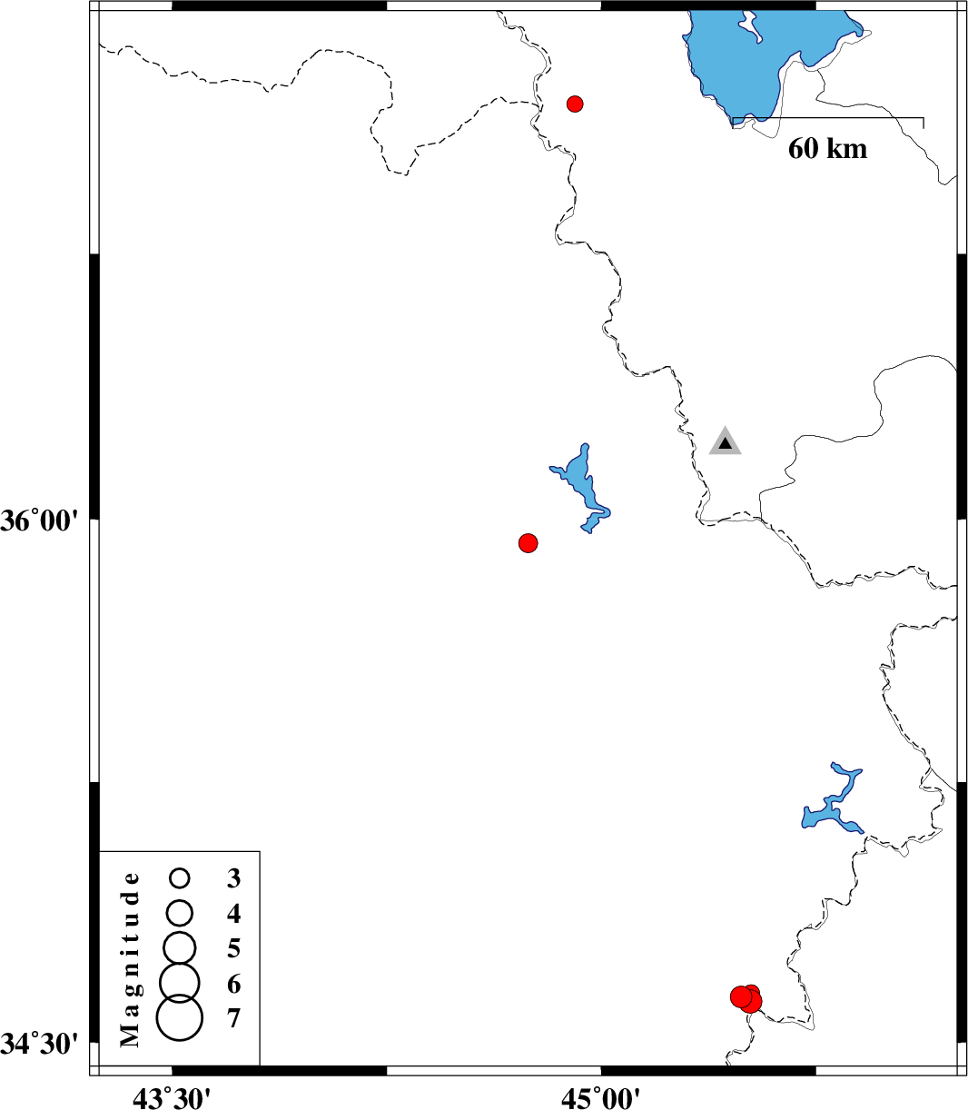 | 2019/01/15 | 01:55:04.6 | 05:25:04.6 | 34.642 | 45.523 | 17 | ML2.7 | Iraq, 15 km North of Qasr-E-Shirin |