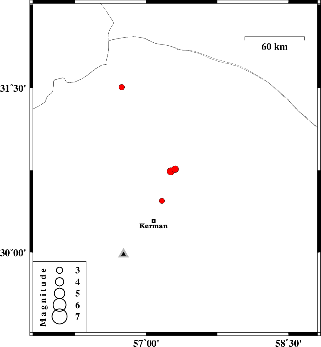 | 2019/01/20 | 23:36:09.3 | 03:06:09.3 | 30.471 | 57.165 | 14 | ML2.6 | Kerman Province, 22 km North of Kerman | ||
