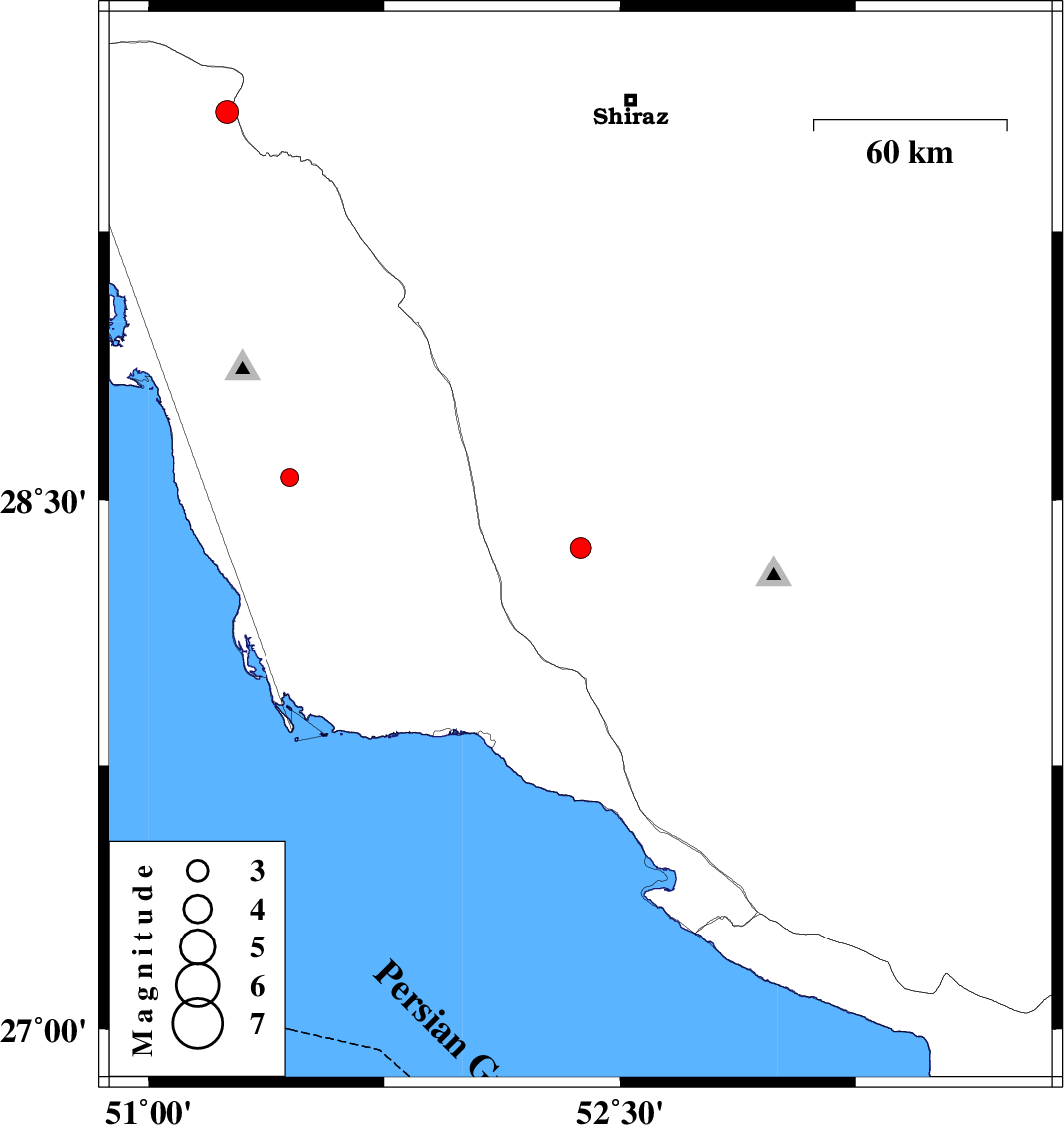 | 2019/01/21 | 22:33:59.8 | 02:03:59.8 | 29.586 | 51.249 | 14 | ML3.2 | Bushehr Province, 36 km North of Borazjan |